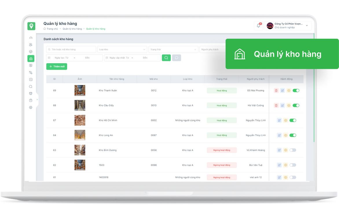 • Phân loại kho theo chức năng sử dụng, quản lý kho theo từng nhà phân phối.